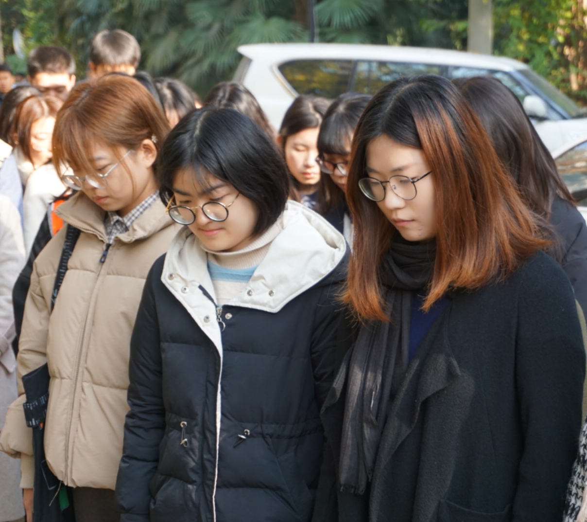 上午1001分防空警报准时响起,同学们神情严肃庄重,肃立在魏特琳雕像前,为在南京大屠杀中不幸遇难的同胞们默哀。