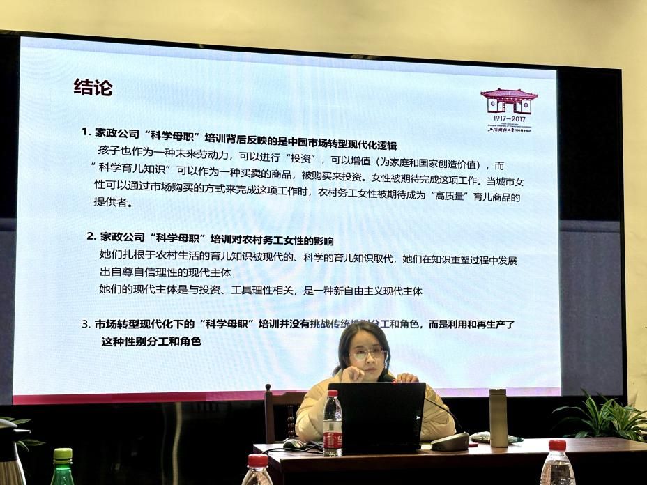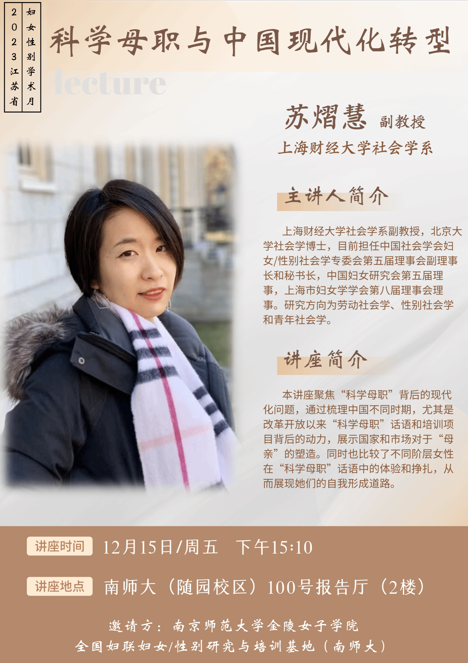 12月15日下午,江苏省“妇女/性别研究学术月”南京师范大学专场第三场讲座——“科学母职与中国现代化转型”在南京师范大学随园校区100号楼举行。讲座特别邀请到上海财经大学社会学系副教授苏熠慧教授作为主讲人。