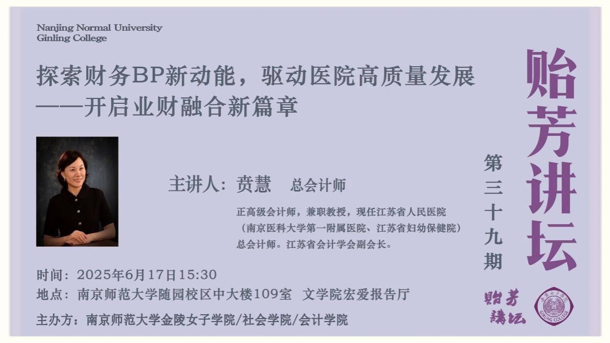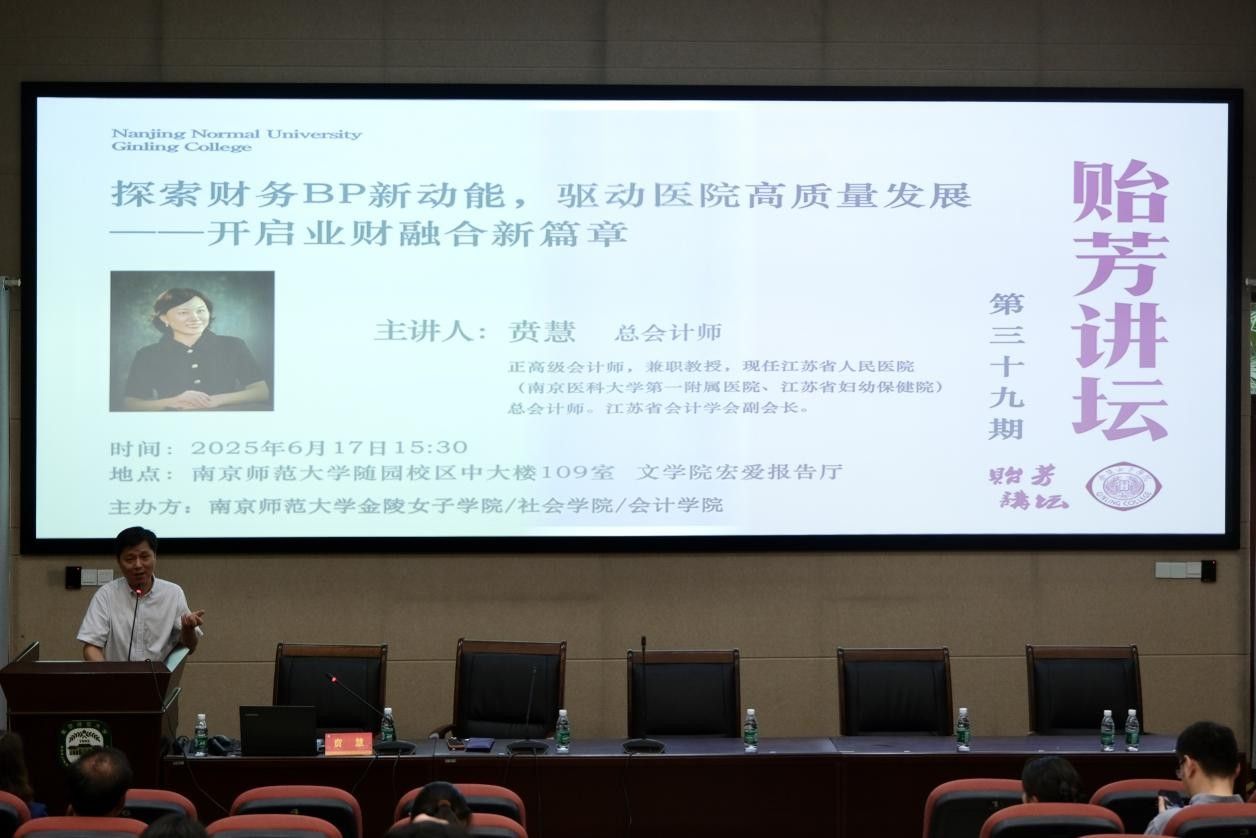 /社会学院/会计学院在随园校区中大楼109室文学院宏爱报告厅成功举办第三十九期“贻芳讲坛”。本次讲坛以“探索财务BP新动能,驱动医院高质量发展——开启业财融合新篇章”为主题,特邀江苏省人民医院总会计师、正高级会计师、兼职教授贲慧担任主讲人。由博彩网址大全