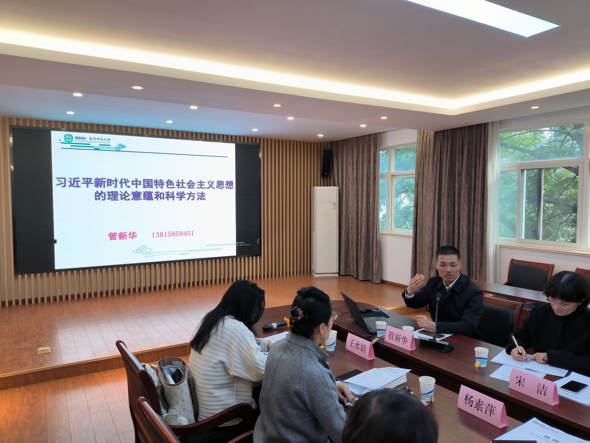 学习研讨会共分两个阶段。第一阶段,校马克思主义学院管新华教授作了题为“习近平新时代中国特色社会主义思想的理论意蕴和科学方法”的学习辅导报告。学院党委邀请党建联盟单位审计处党支部开展“理论联学”活动,审计处处长、党支部书记赵志鲲等审计处党支部全体成员一同聆听了报告。