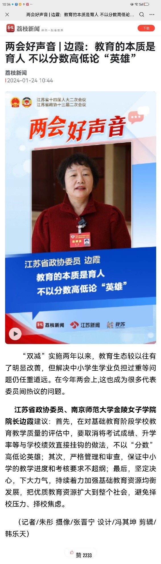 的研究方向,提交了4份提案,涉及基础教育、养老与家政服务等方面。关于基础教育的提案是:教育的本质是育人,不以分数高低论“英雄”。边霞建议在对基础教育阶段学校教育教学质量的评估中,要取消将考试成绩、升学率等与学校绩效直接挂钩的做法,不以“分数”高低论英雄;其次,严格管理和审查,保证中小学的教学进度和考核要求不超纲;第三,建议充分利用数字化手段,对儿童的入睡时间、运动时长、进校及离校时间等进行监管,加强对学生学业负担的了解和监控;最后,坚定决心,下大力气,持续着力加强基础教育资源均衡发展,把优质教育资源扩大到整个社会,避免择校压力、择校焦虑。在养老问题上,提出应以分层分类需求为导向,通过聚焦多维困难人群,调整供给优先序列,实现供给差异化等多种途径,提升养老服务供给效能,推进江苏农村困难群体养老服务高质量发展。针对家政服务业的进一步发展,边霞建议,设立家政学科及研究基地建设专项项目,打造学科及研究高地;设立家政学硕士、博士学位授权点,夯实研究队伍;将具有“家政学”专业背景列入相应岗位的公务员招考资格条件中,做到专业的人管专业的事,改善政府的家政管理效能。