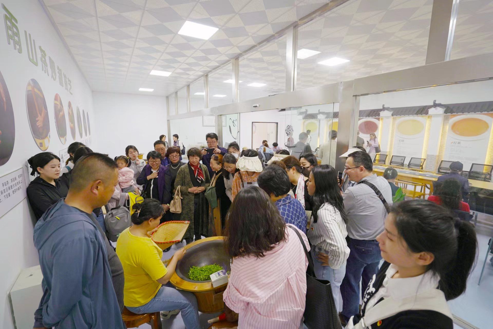 老师们首先来到盱眙县雨山茶场开展采茶劳动。在工作人员的指导下,老师们背着竹篓走进茶树的行间,双手在茶树间飞舞,一片片嫩芽嫩叶落入竹篓中,不一会儿大家收获满满。湿润的泥土和清新的空气伴随着花香、鸟鸣,让大家感受到大自然的魅力。在茶场的厂房,炒茶师介绍了炒茶的手法,强调对锅温的精准拿捏和把握是成功炒制的关键。老师们把刚采的茶叶倒进铁锅后,一片片小绿叶经过炒茶师的杀青、理条、整形、烘干等一系列工序后茶叶渐渐成形,特有的清香气也随着蒸发出的气体盈满茶厂。部分老师还亲身体验了炒茶。老师们参观了茶场全电气化茶叶生产线,了解了从鲜叶入库、绿茶、红茶生产、毛茶储存、茶叶精制、包装仓储一条线全过程。