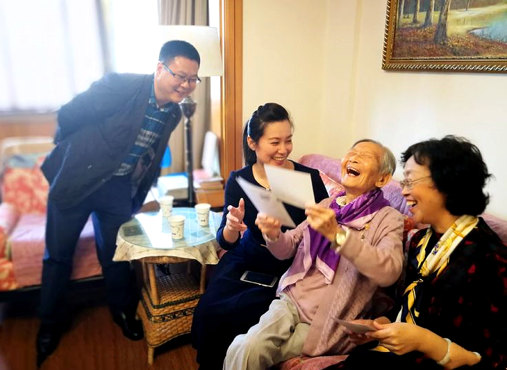 明霞大姐特别感谢学院领导上门探望,还兴致勃勃地现场为大家打了一套太极拳,大家共度欢乐的时光。最后衷心祝愿世纪老人明霞大姐健康快乐、安享天伦!