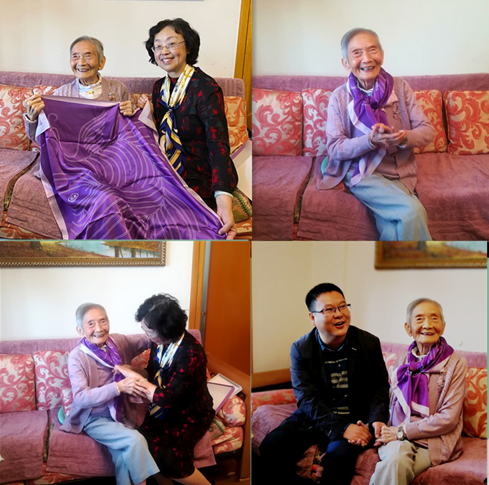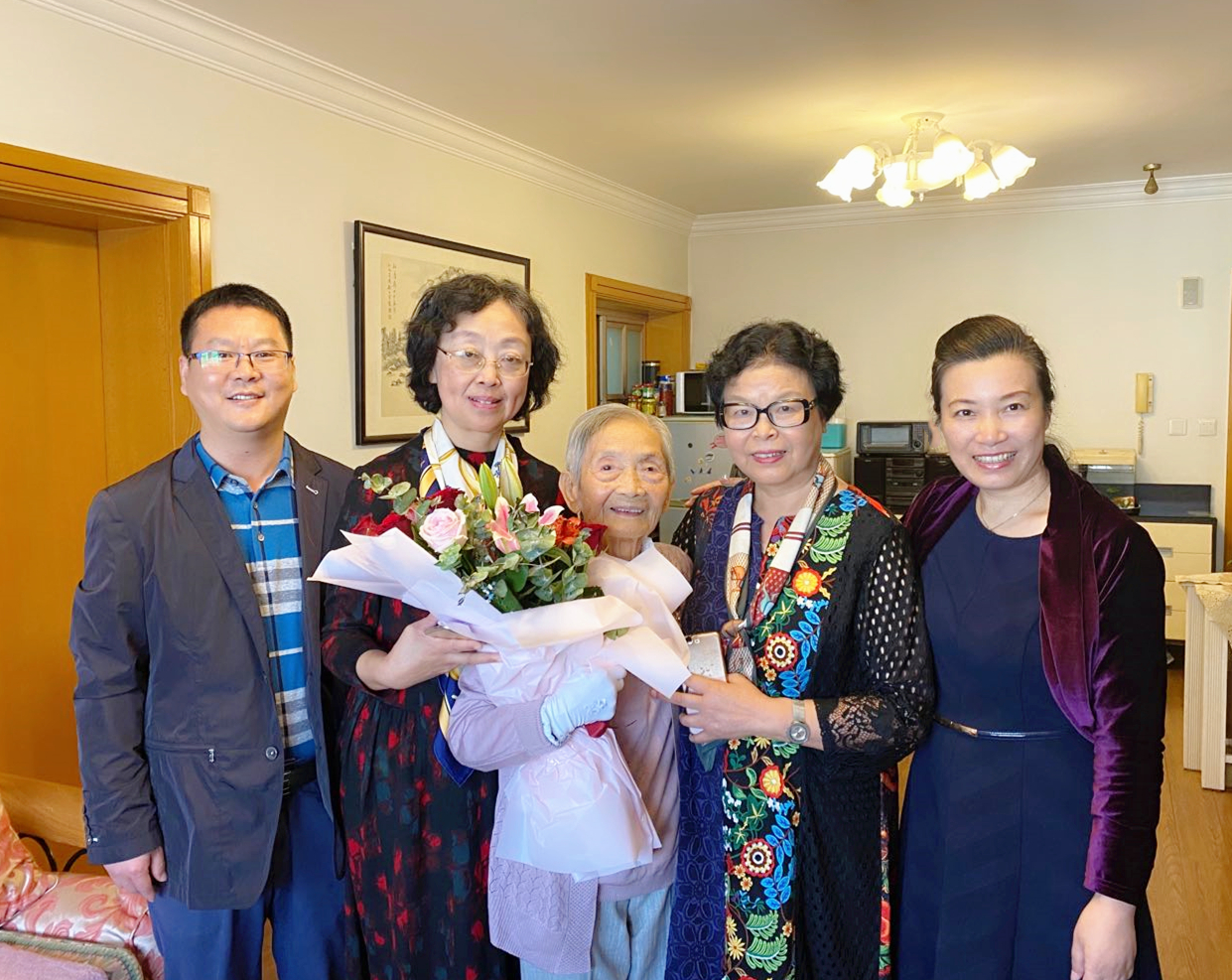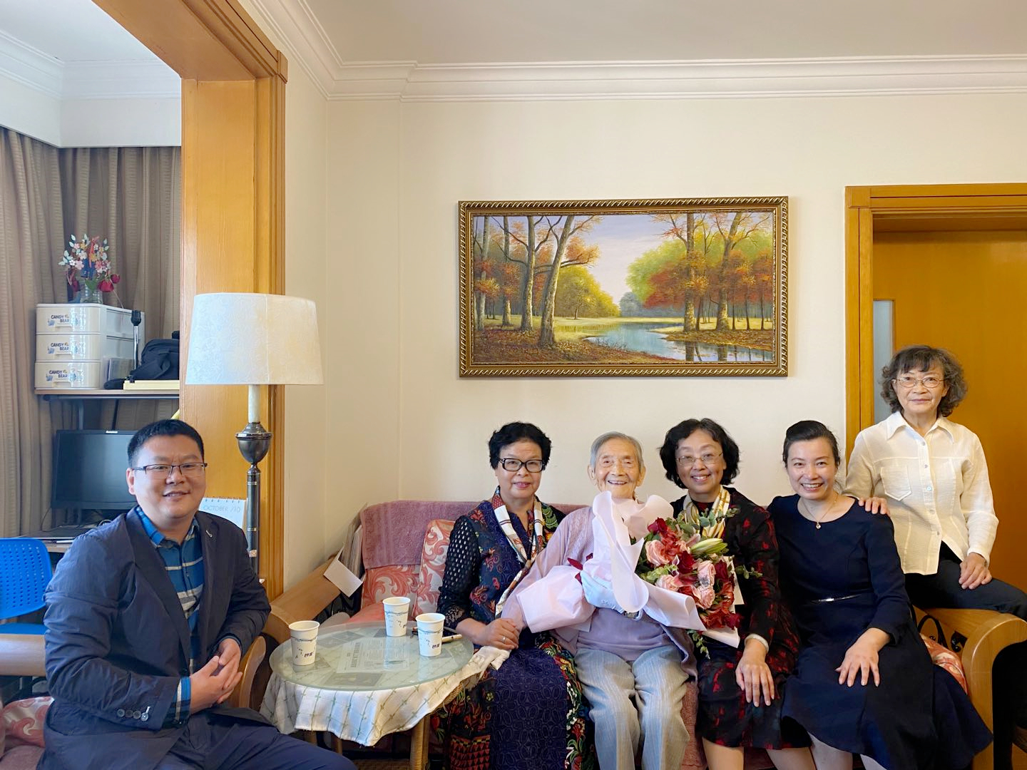赵媛院长、杨素萍副院长、吴贻芳研究中心主任钱焕琦教授专程从南京赴上海,带着鲜花和生日蛋糕,看望拜访金女大百岁校友王明霞前辈。