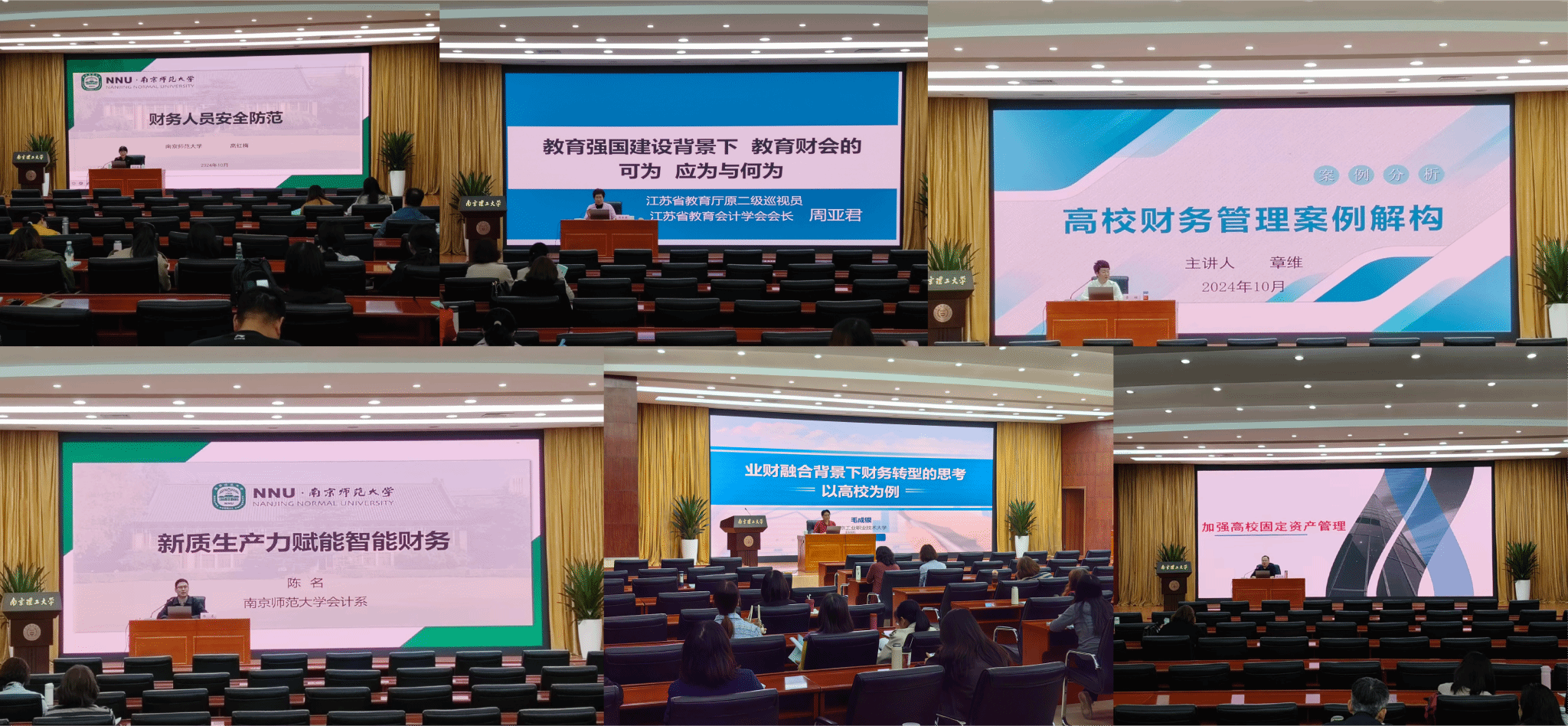 培训期间,江苏省教育厅原二级巡视员、江苏省教育会计学会会长周亚君等六位专家分别做《教育强国建设背景下高校财务应为可为 何为》《高校财务人员安全防范》《高校财务管理案例剖析》《业财融合背景下高校财务转型思考》《新质生产力如何赋能智能财务》《加强高校固定资产管理》等主旨讲座。培训结束,有来自16所在宁高校的财务人员现场交流了学习体会和工作实践分享。