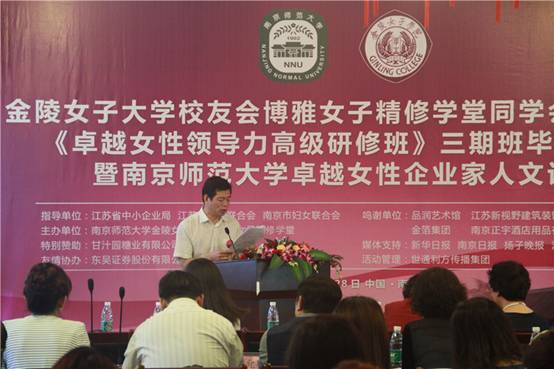 党委书记江希和教授对江苏省中小企业局、江苏省妇联、南京市妇联以及长期以来关心、帮助和支持学院工作的朋友们表示感谢。学院目前已开设三期《卓越女性领导力高级研修班》,江书记对本次毕业的三期班同学们表达了衷心的祝愿,希望美丽的女性菁英们在金陵女子大学校友会这个平台上有更多的收获。