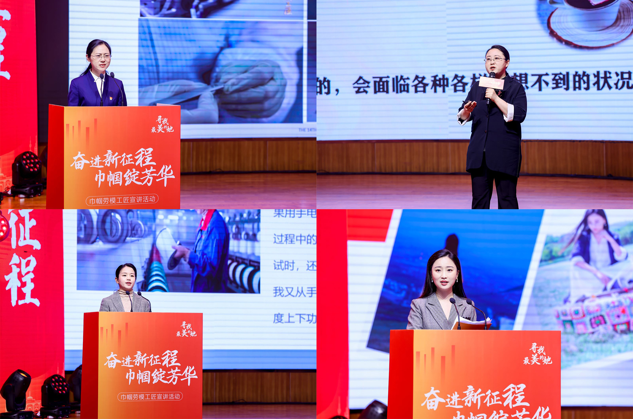 四位巾帼劳模工匠以演讲的形式讲述她们的感人事迹。中国电子科技集团公司第十四研究所微电路总装师、2023年“全国五一巾帼标兵”顾春燕讲述了她怀着对军工事业的热爱,与尖端装备的生产制造结缘和她所理解的工匠精神;中国电子科技集团公司第五十八研究所射频与模拟电路研究室主任、2023年“全国五一巾帼标兵”蒋颖丹讲述了她在国产芯片研发岗位上坚守高水平科技自立自强的苦与乐;江苏聚润纺织科技有限公司倒筒车间主任、2021年“全国五一巾帼标兵”房娟以《青春因磨砺而出彩 人生因奋斗而升华》为题,讲述了她从学员到班长再到质量主管的成长历程;江阴嘉特网络信息有限公司总经理、2023年全国五一巾帼标兵贾嘉作为新业态代表,讲述了她用小小的毛线带动更多姐妹就业,带动传统编织飞向互联网、编织出彩人生的创业故事。