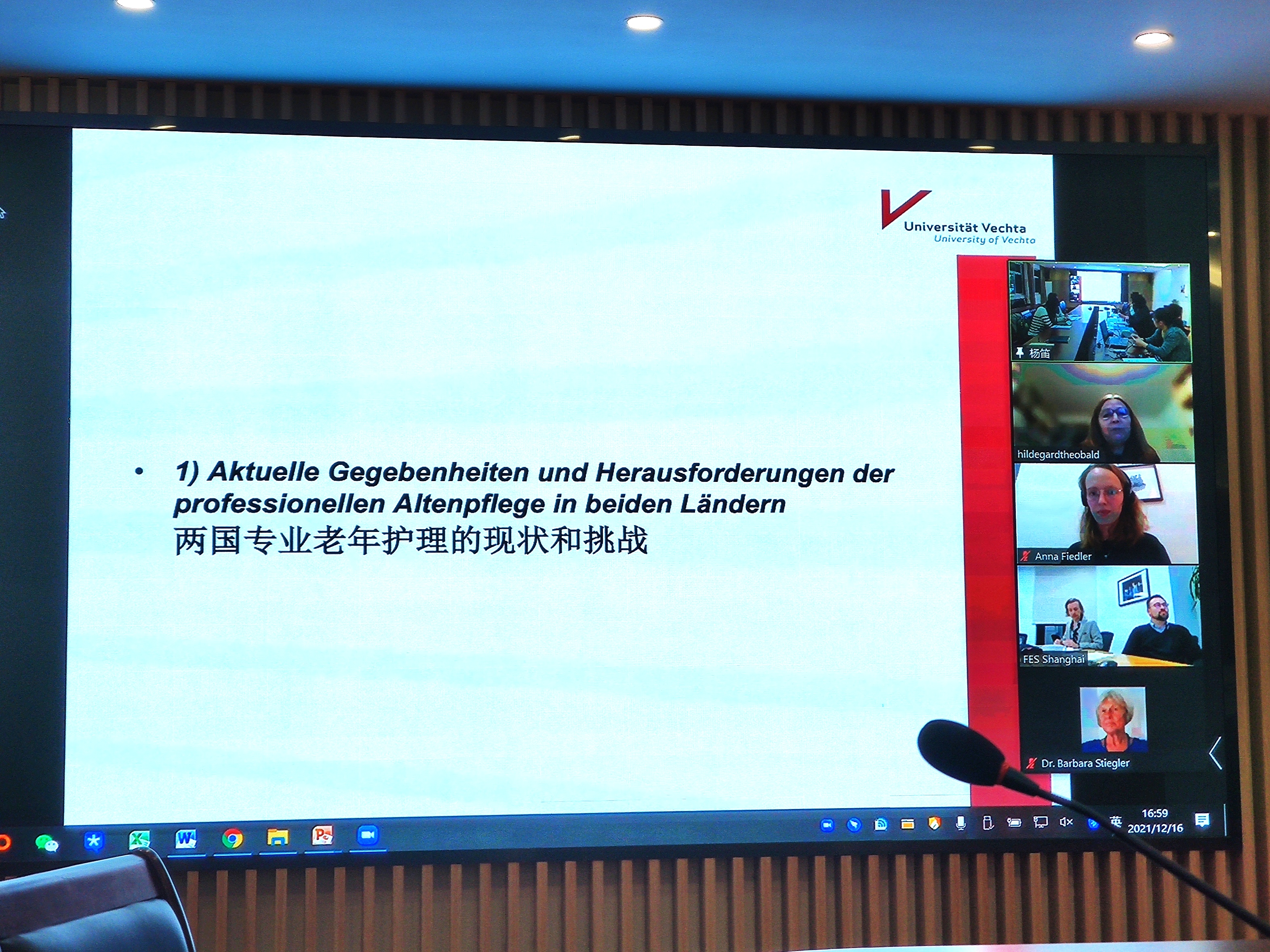 雷柏曼先生与赵媛教授分别介绍了艾伯特基金会和博彩网址大全 的基本情况与研究计划,并对与会者的到来表示热烈欢迎。博彩网址大全 金一虹教授和费希塔大学Hildegard Theobald教授分别就中德两国专业老年护理的基本情况进行了综合介绍。两位学者围绕两国老年护理的现状与挑战、培训与工作条件、机构护理的优势和劣势等内容对两国的共性和差异进行了简要汇报。随后,与会人员就两国的对比性发现、政策经验的可借鉴性以及设置联合研究议题的可行性等问题进行了进一步的讨论和交流,针对论证的具体化、可比较的结构与共同的优先事项达成一致,并敲定了未来专题研讨会议的可选议题、会议程序与时间安排。最后雷柏曼及赵媛教授宣布本次讨论会顺利结束。