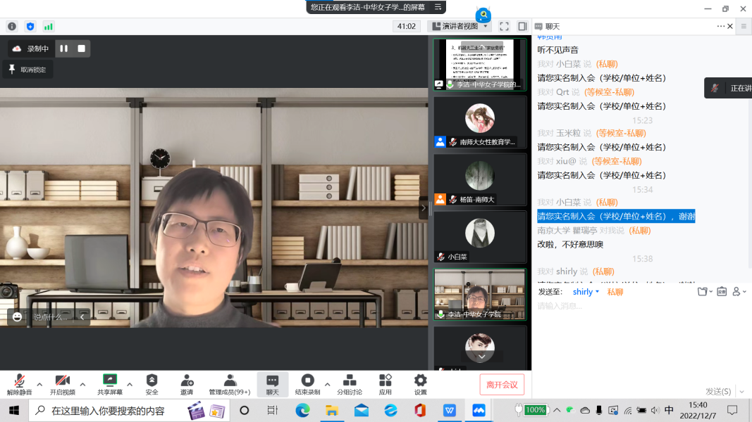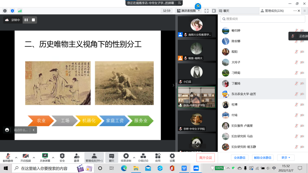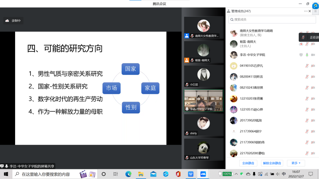 12月7日下午,江苏省“妇女/性别研究学术月”南京师范大学专场第五场讲座——“重新发现‘再生产’——性别研究的结构性视角”在线上借助腾讯会议平台顺利举行。此次讲座邀请到了中华女子学院的李洁教授分享自己在性别研究领域的研究与思考。李教授是清华大学社会学系博士,美国伯克利大学、马萨诸塞大学阿默赫斯特分校访问学者,现任中华女子学院社会工作学院教授,兼任中国社会学会性别社会学专委会理事长等职务。她的主要研究方向为“社会再生产理论”视角下的性别、劳动和家庭议题。
