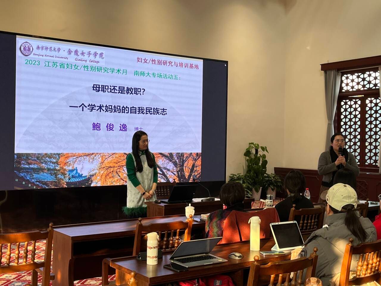 1227日下午,江苏省“妇女/性别研究学术月”南京师范大学专场第五场讲座在南京师范大学随园校区100号楼成功举办。此次邀请到的是南京师范大学教育学博士、教育科学学院的青年教师鲍俊逸来做题为“母职还是教职?一个学术妈妈的自我民族志”的讲座。鲍老师通过分享自身两次成为母亲,两次获得教职的故事,以自我民族志的形式,深入探讨了在人生选择的进退间体验到的女性成长的困惑并进一步引发了在身份转换的过程中对于师者与学者双重身份的反思。