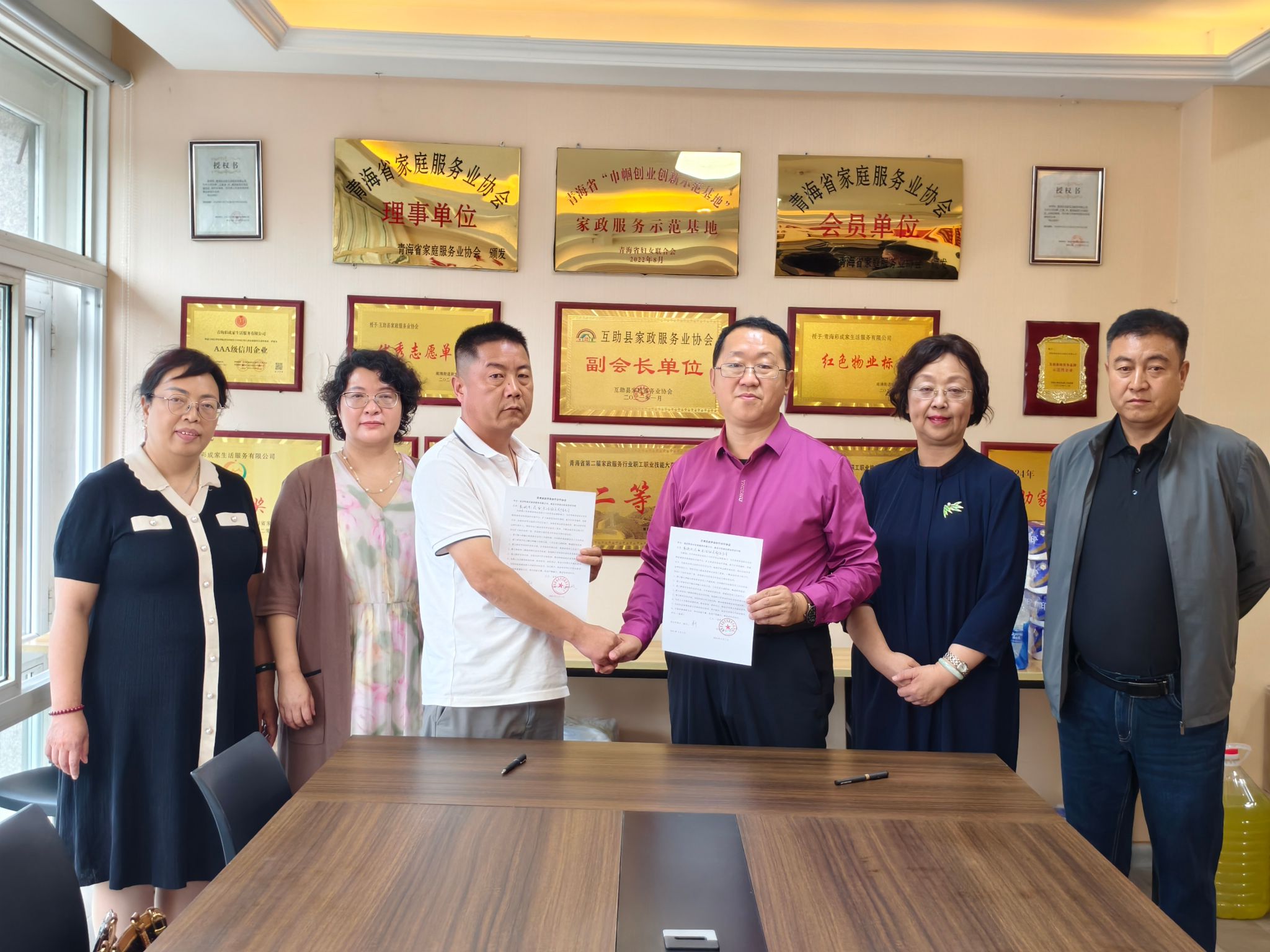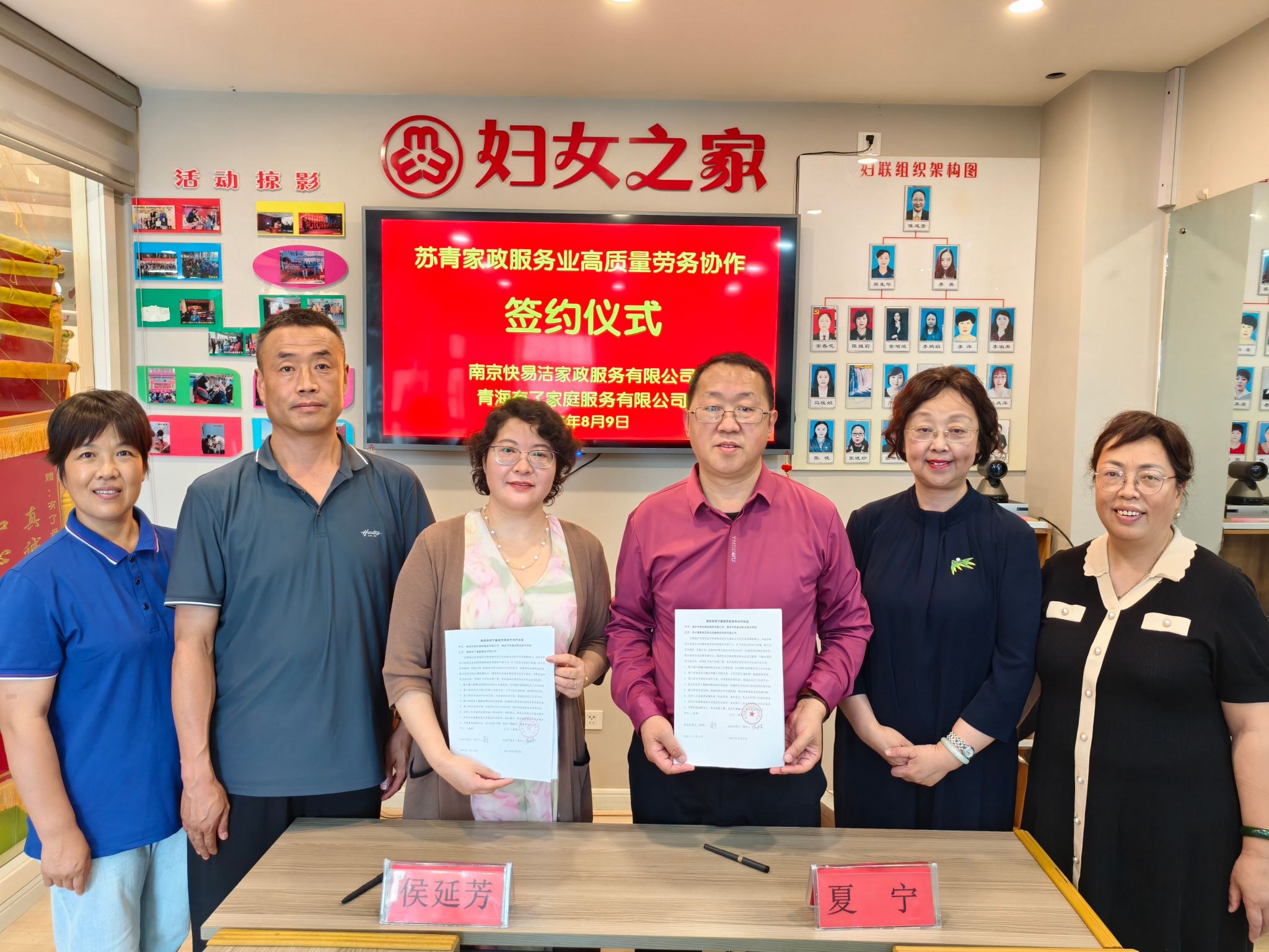 江苏省家政学会理事长赵媛与青海省家庭服务业协会会长侯延芳签订了《苏青家政服务业高质量发展合作协议》,南京市快易洁职业培训学校校长夏宁与西宁夏都家匠职业技能培训学校校长侯延芳签订培训合作协议,南京快易洁家政集团总经理夏宁分别与青海有了家庭服务有限公司、青海彩成家生活服务有限公司签订了劳务合作协议