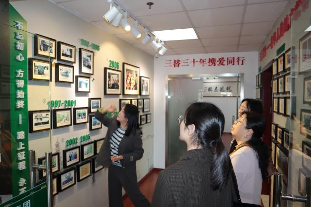 何主席首先带领调研组来到三替集团博彩网址大全墙,向调研组介绍了三替集团的企业发展历史和博彩网址大全。她向调研组介绍到:“三替始终坚持以人为核心,用心把服务做精做好,始终将家政行业更好发展作为三替人的奋斗目标。”