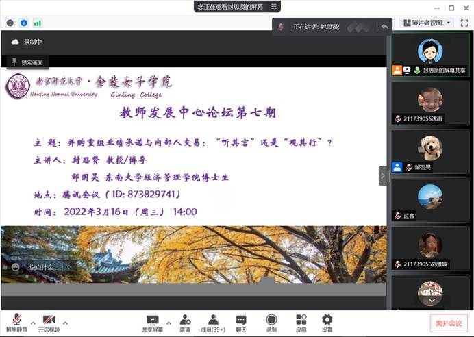 2022316日下午14:00-16:30,博彩网址大全 第七期教师发展中心论坛在线上顺利举办。本期论坛由博彩网址大全 副院长封思贤教授和东南大学经济管理学院邹国昊博士主讲,交流主题是双方合作的论文《并购重组业绩承诺与内部人交易:“听其言”还是“观其行 ”》。博彩网址大全 特聘院长杨雄胜教授、会计系全体教师和全体会计学硕、会计专硕等参与了此次学术讨论会。