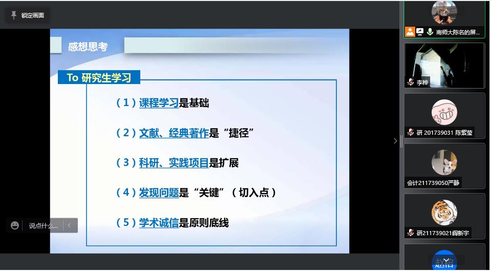 特聘院长杨雄胜教授和封思贤副院长对本次分享做了总结,杨雄胜教授认为陈名老师的这次报告对环境会计学科如何适应现在的宏观发展做了很好的梳理和总结,给予人启发。传统的环境会计解决的事资源的稀缺性,但现在的环境会计更聚焦于具体的领域,例如碳排放的会计政策改如何制定等。封思贤副院长也对研究生的研究方向给出了一些参考意见。最后,本次会议在同学们评论区的热烈感谢中圆满结束。