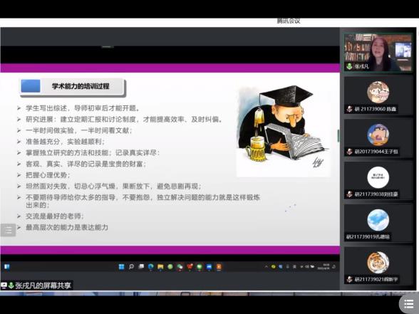 首先,张戌凡教授对职业人与职业化的概念进行了详细的阐述,从知识、技巧、理解能力、分析判断能力与经验能力这五个角度分析了显性职业素养,又从职业态度、职业习惯以及职业道德的角度分析了隐性职业素养。紧接着,她又对研究生需要培养的学术能力进行了分析,并对学术能力的培养方式给出了建议。张老师提到,对于学术工作而言,需要同学们掌握信息搜索能力、信息整合能力以及信息输出能力,而这些能力也同样是职场所需要的。
