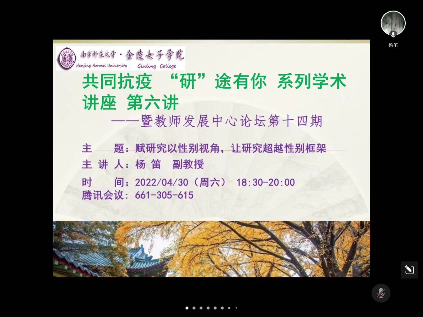 女性学系、劳动与社会保障系杨笛副教授,以线上会议的方式为校内外近200名师生带来“共同抗疫,‘研’途有你”系列讲座第六讲暨教师发展中心论坛第十四期讲座——“赋研究以性别视角,让研究超越性别框架”。本次讲座由博彩网址大全