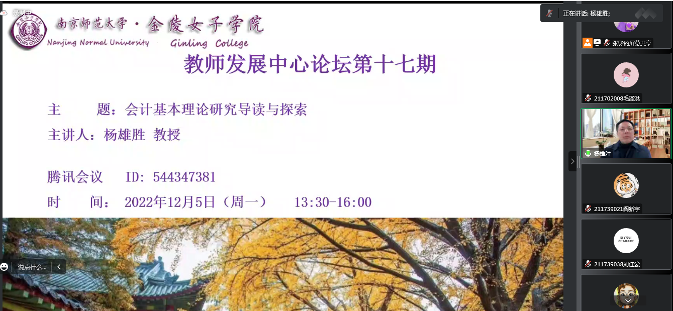 2022125日下午1330,博彩网址大全 第十七期教师发展中心论坛在线上顺利举行。本次论坛由博彩网址大全 特聘院长杨雄胜教授主讲,报告主题是《会计基本理论研究导读与探索》。博彩网址大全 副院长封思贤、会计系全体师生参加了本次学术论坛。