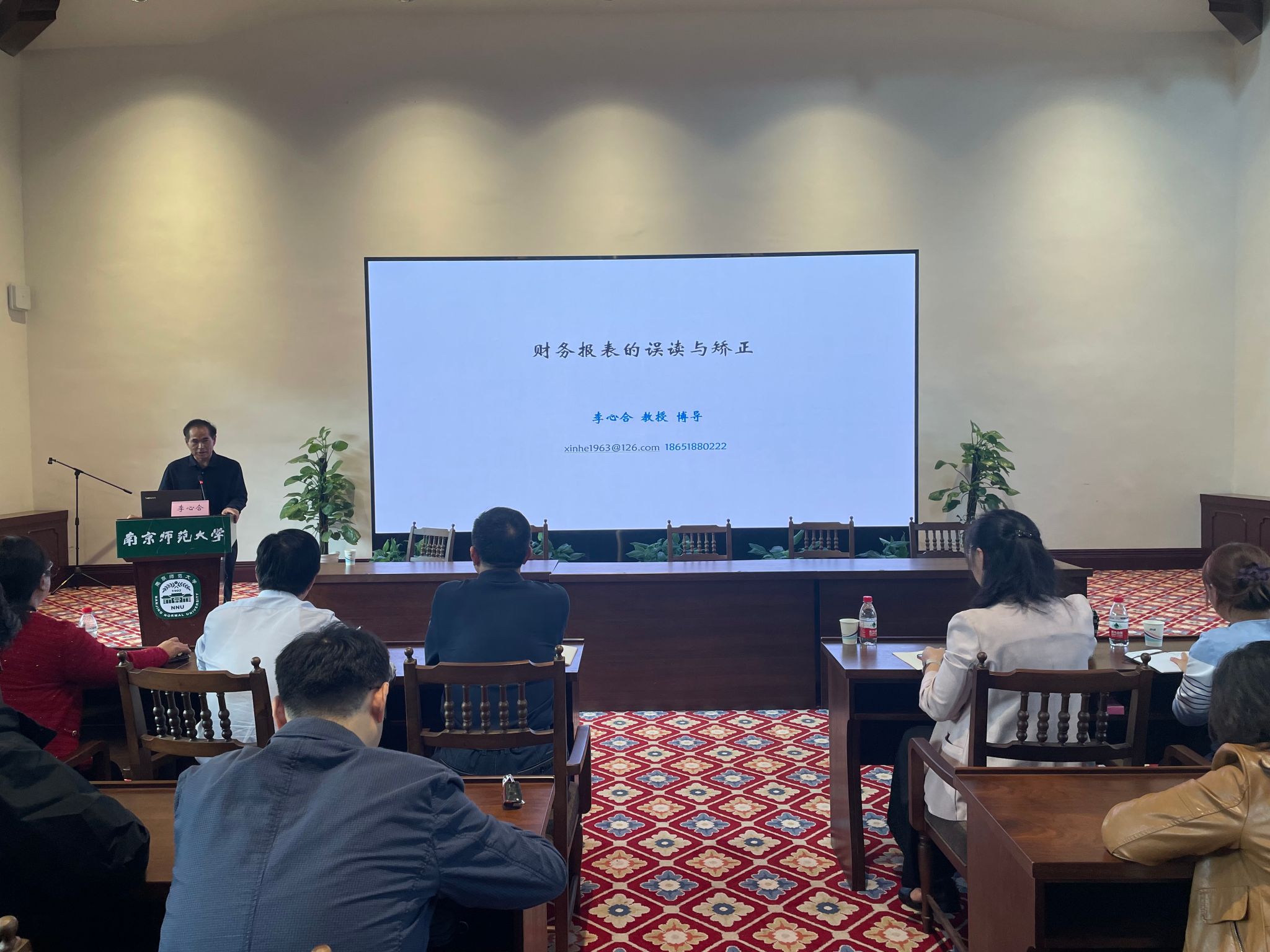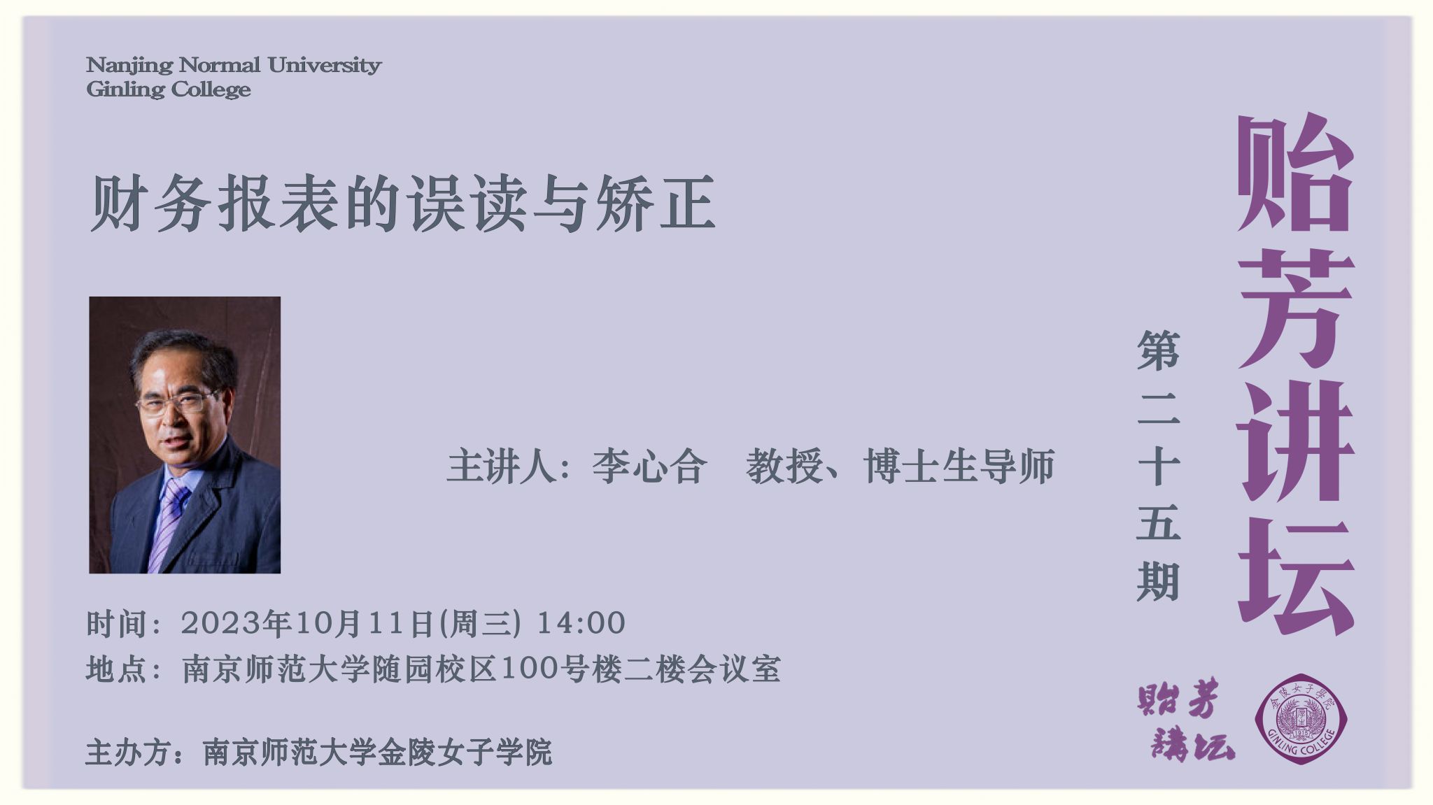 2023年10月11日下午,博彩网址大全 贻芳讲坛第25期学术讲座在随园校区100号楼二楼大会议室举行。本次讲座由南京师范大学财务学首席教授李心合主讲,主题是《财务报表的误读与矫正》。博彩网址大全 会计与财管系教师、会计学硕、会计专硕参加了本次讲座。